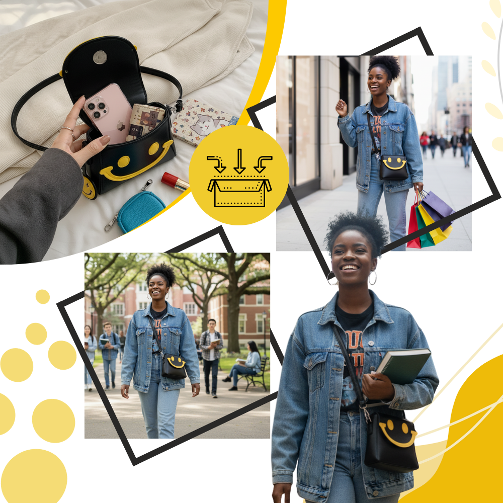 The Cheerful Smile Crossbody Purse is made for life on the go—whether you're headed to a brunch, playdate, shopping trip, or campus. With its compact dimensions of 13 cm (5.1 in) high, 14 cm (5.5 in) wide, and 7 cm (2.8 in) deep, it fits your essentials without adding bulk. Lightweight and hands-free, it's ideal for everything from travel and sightseeing to casual events and creative workspaces. Wherever the day takes you, this cheerful, easy-to-wear bag keeps up—stylishly and effortlessly.