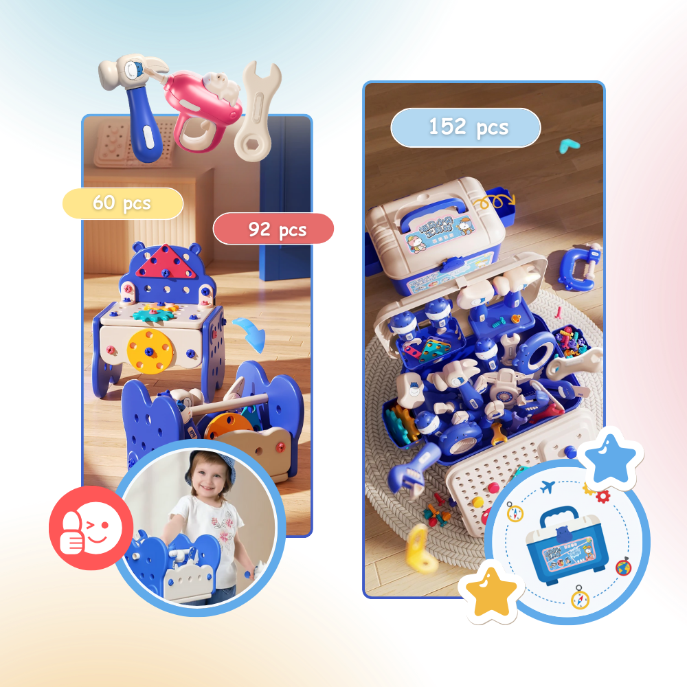 Each Tool Bench Set is designed with portability in mind—but the form it takes depends on the set size. The 152-piece deluxe version folds into a large-capacity toolbox with a sturdy built-in handle, making it perfect for travel, tidy storage, or taking the whole workshop to grandma’s house. For the smaller sets, like the 60 or 92-piece versions, the tools and bench pieces can be reassembled into a compact carry-on toolbox, ideal for little hands to lift and transport on their own. Both designs teach kids independence through organization, while parents enjoy a mess-free, easy-to-store toy that travels as easily as it entertains.